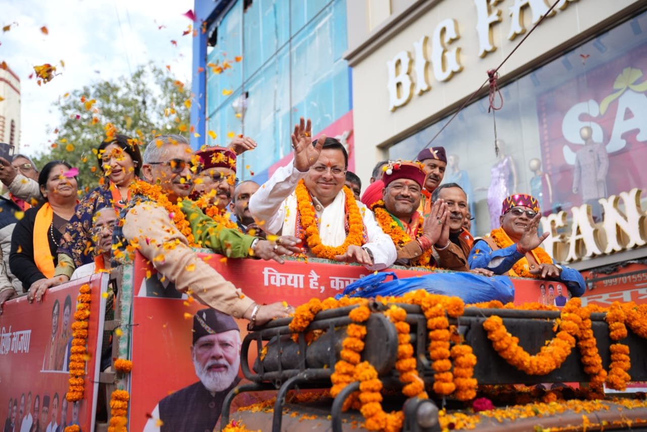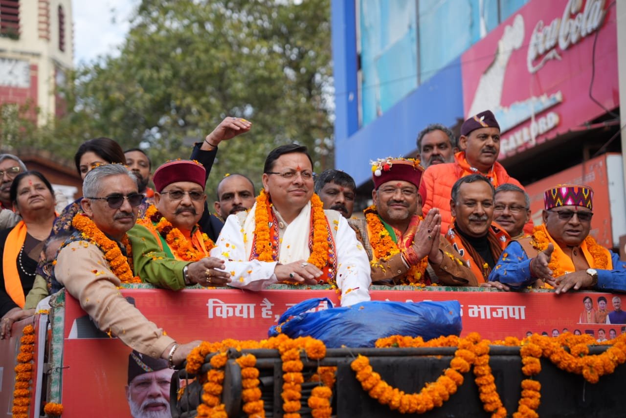 रोड शो भाजपा महानगर देहरादून कार्यालय से प्रारंभ हुआ रोड शो गांधी पार्क पर कार्यकर्ताओं के द्वारा मुख्यमंत्री के रथ पर पुष्प वर्षा की गई मुख्यमंत्री पुष्कर सिंह धामी जी ने भी कार्यकर्ताओं को पुष्प माला भेट की रोड शो पलटन बाजार होते हुए राजा रोड एवं द्रोण होटल तक चला रोड शो की प्रथम पंक्ति में युवा मोर्चा के कार्यकर्ता हजारों की संख्या में उपस्थित रहे मोर्चा के द्वारा नारेबाजी भारत माता की जयकारे के साथ रैली में पूर्ण जोश दिखाई दे रहा था द्वितीय पंक्ति में महिला के द्वारा नृत्य करते हुए अपनी खुशी को जाहिर किया गया । महिलाएं एवं युवाओं के द्वारा मुख्यमंत्री एवं प्रत्याशी के नारों के साथ पलटन बाजार गूंज रहा था कई स्थानों पर व्यापारियों के द्वारा सौरभ थपलियाल को अग्रिम शुभकामनाएं दी गई कई स्थानों पर मुख्यमंत्री एवं सौरभ थपलियाल को पुष्प माला रुद्राक्ष माला पहनकर अभिनंदन हुआ। रोड शो के दौरान जनता का अपार स्नेह प्राप्त हुआ साथ ही कार्यकर्ताओं में इतना जूस देखकर मुख्यमंत्री पुष्कर सिंह धामी जी ने रैली के दौरान कार्यकर्ताओं से कहा हम निश्चित तौर पर अपना नगर निगम बोर्ड बनाने वाले हैं सौरभ थपलियाल अधिक से अधिक वोट्स से जीतकर नगर निगम में इतिहास रचने का काम करेगा। रैली में सौरभ थपलियाल जी के द्वारा हजारों कार्यकर्ताओं की साथ मिलकर कचहरी परिसर में शहीद स्मारक पर जाकर शहीदों को अपने चुनाव प्रचार के अंतिम चरण पर कोटि-कोटि नमन कर पुष्पांजलि की।